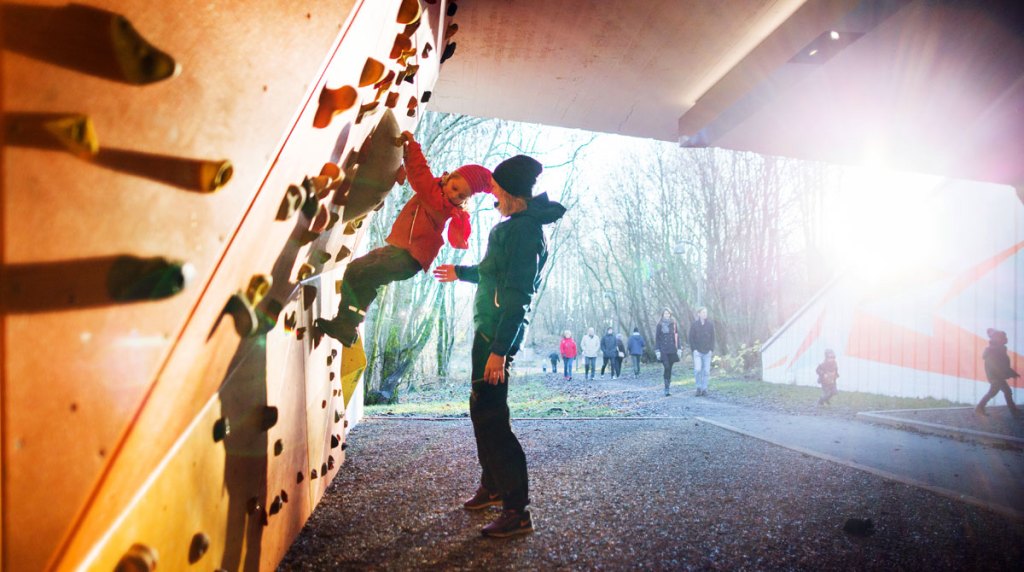 “Tunnelen” (“The tunnel”), is now “an underpass of activities”, a social meeting place, and a point of pride for local residents. The previously dark concrete passage is now a well-lit corridor containing a climbing wall, Norway’s longest monkey bar, a creative exercise area, and an illuminated line which not only lights up the underpass but also tells the story of Ammerud.